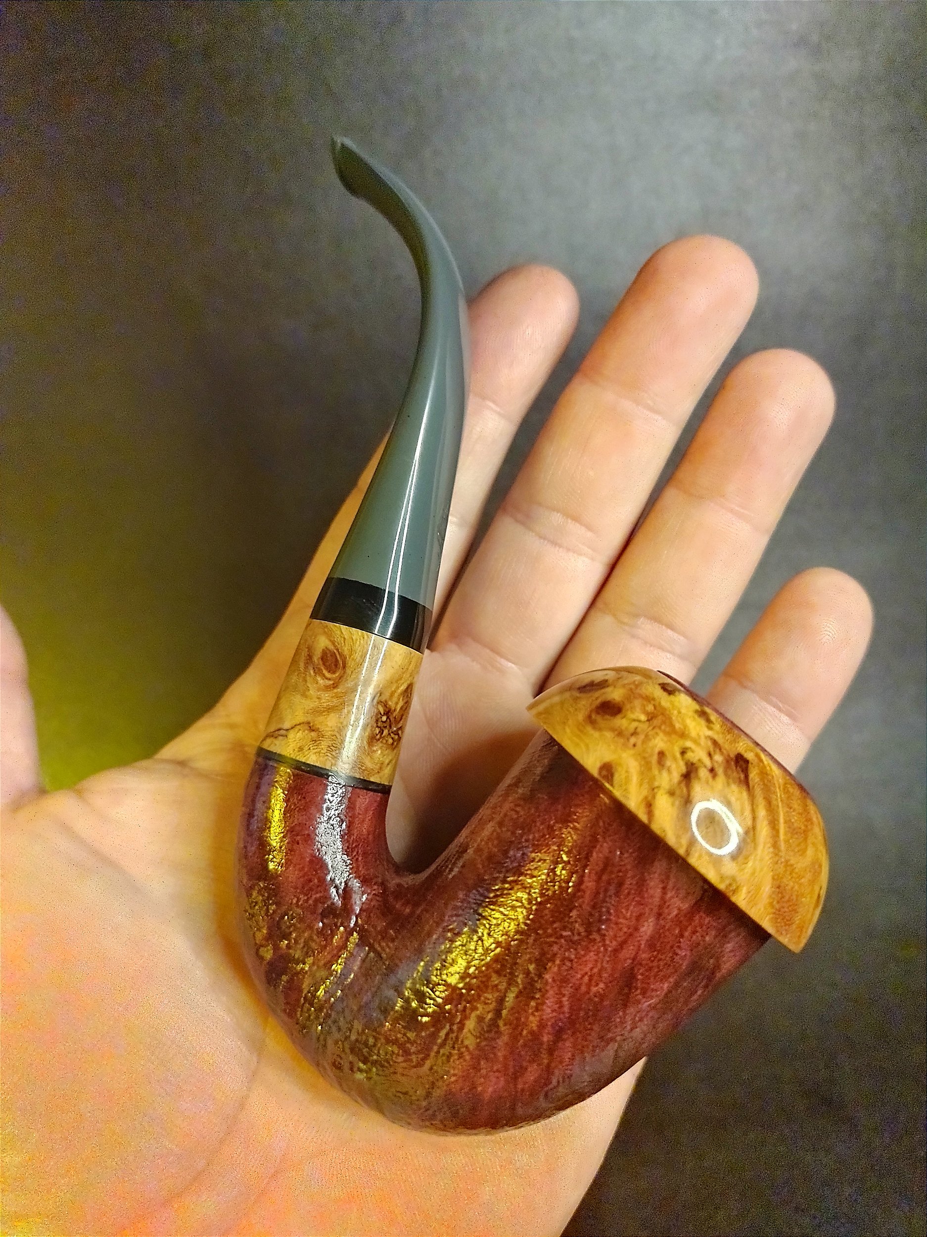 Peça confeccionada em Briar com acabamento jateado (Sandblasted) no corpo da peça, o cap do fornilho é em Cumarú Burl e fornilho em Briar.